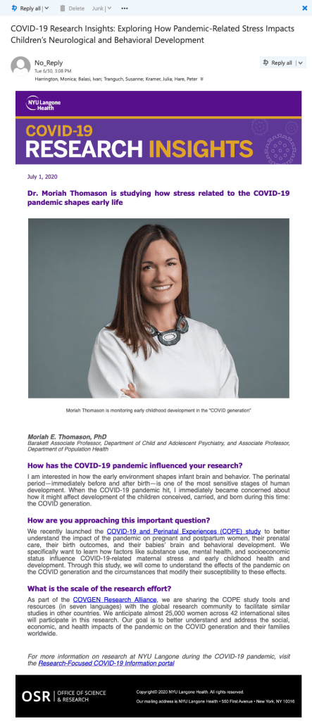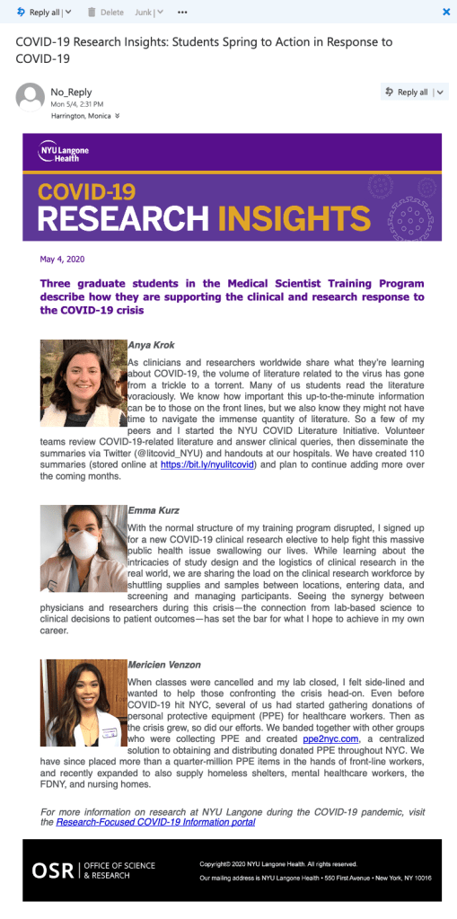 COVID-19 Research Insights was a weekly newsletter highlighting how the NYU Langone research workforce responded during the first months of the COVID-19 pandemic. The newsletter was distributed by email internally to the broad NYU Langone community, and open rates consistently exceeded 25%. I developed the concept and content, conducted interviews, and ghost-wrote the stories.